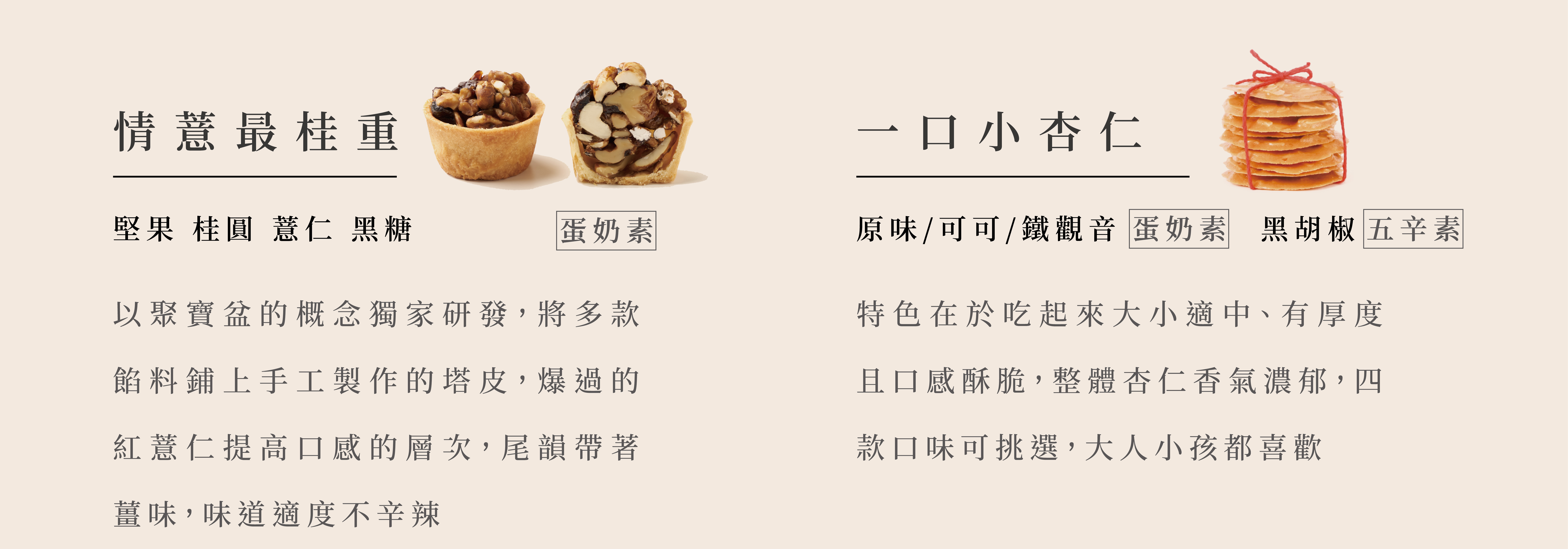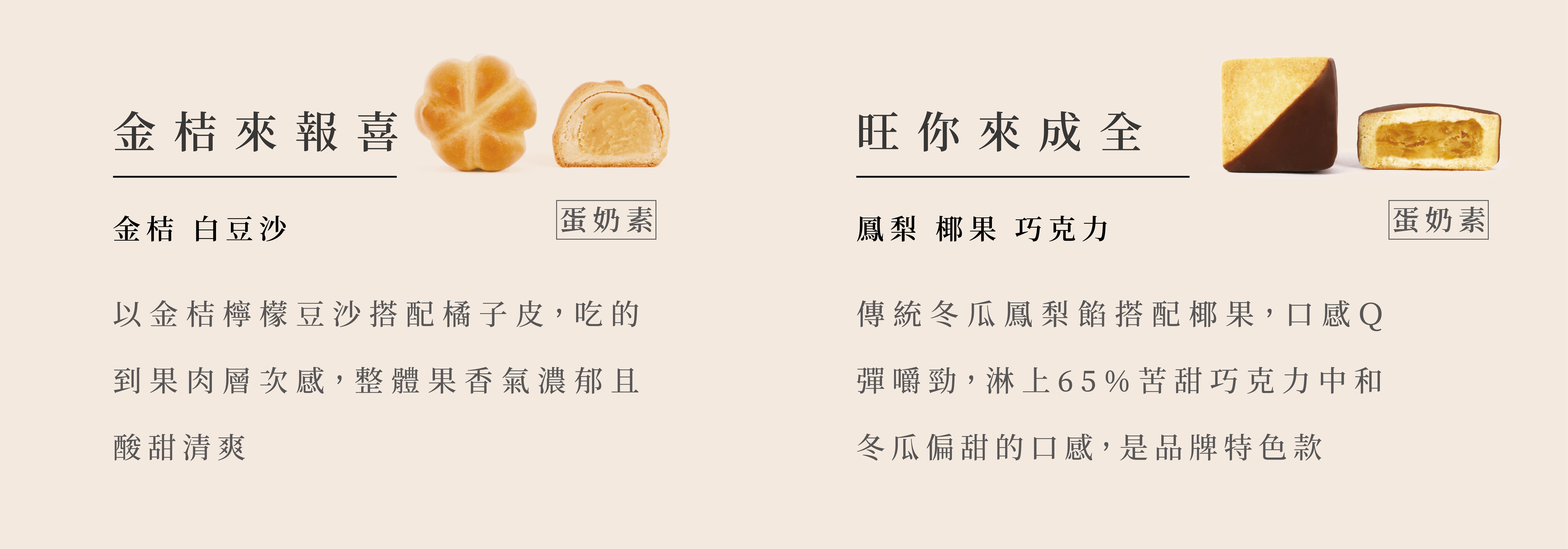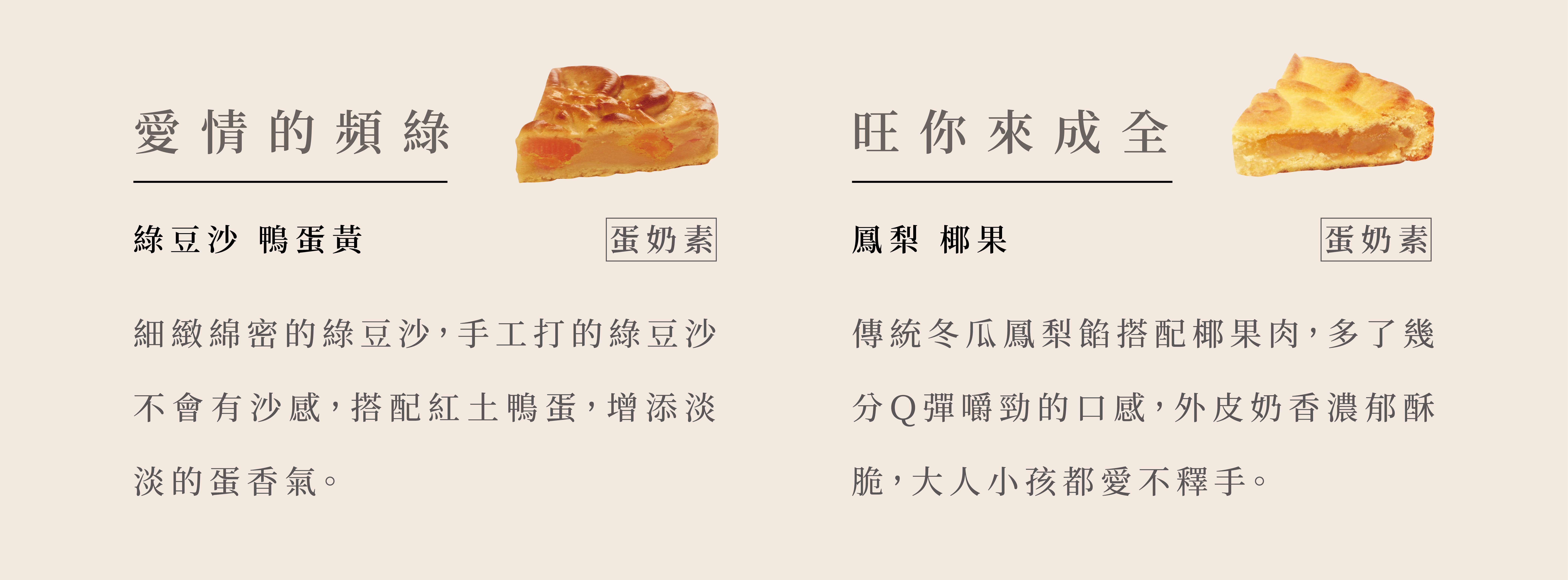 精選喜豐香總店熱銷口味,既保留傳統滋味並調整成當代人風味,即使是年輕人也會非常喜愛的口味,餅模以繩結、喜鵲等等元素,突破傳統形式的感受。質感、質量兼顧。