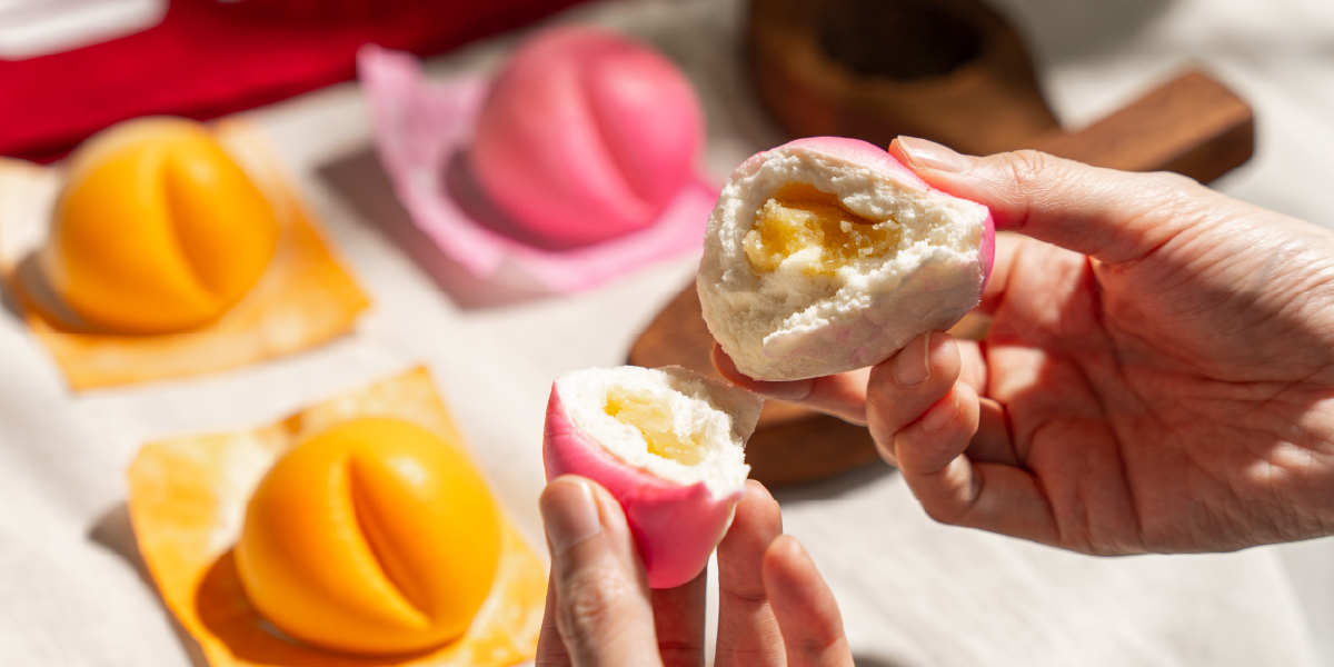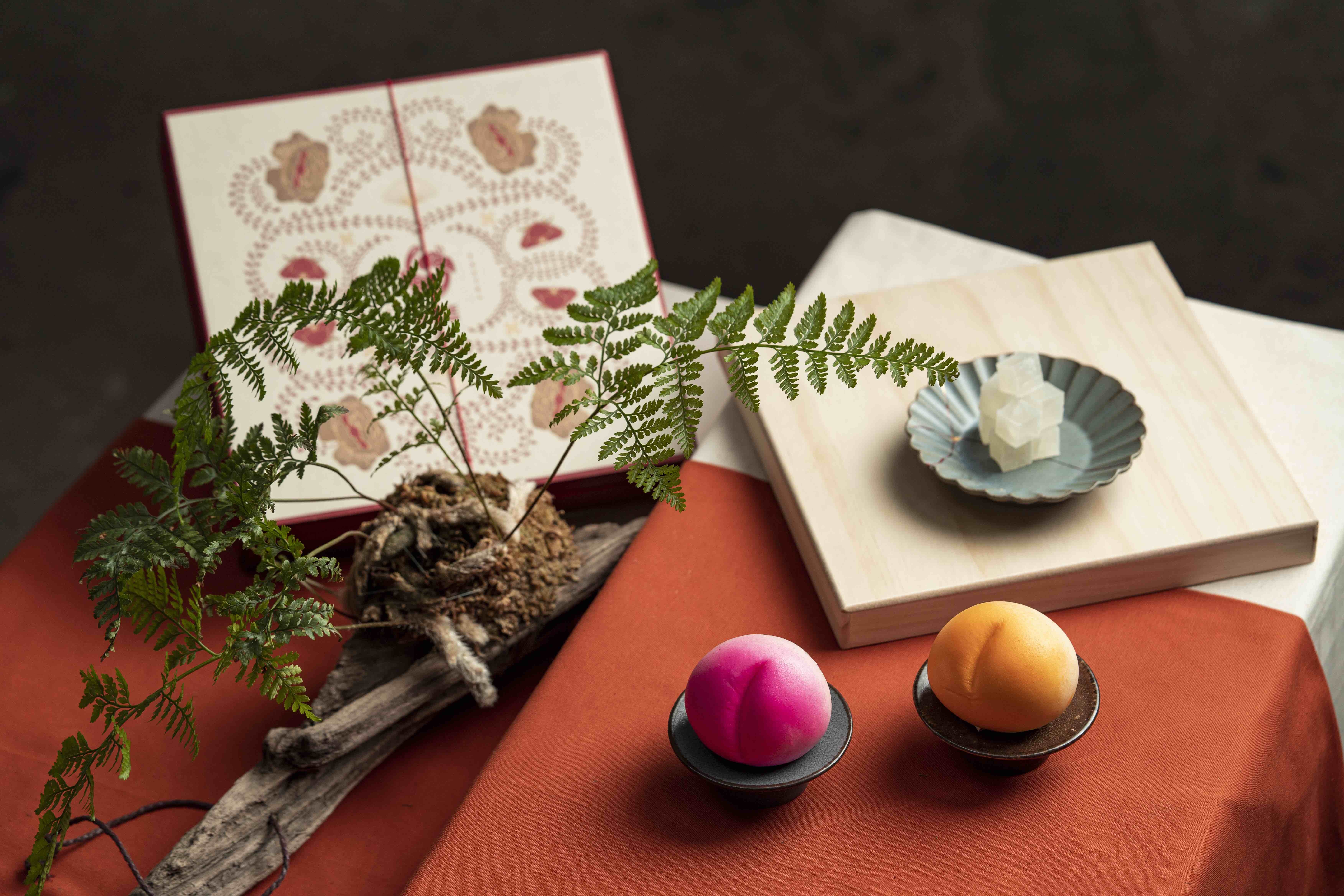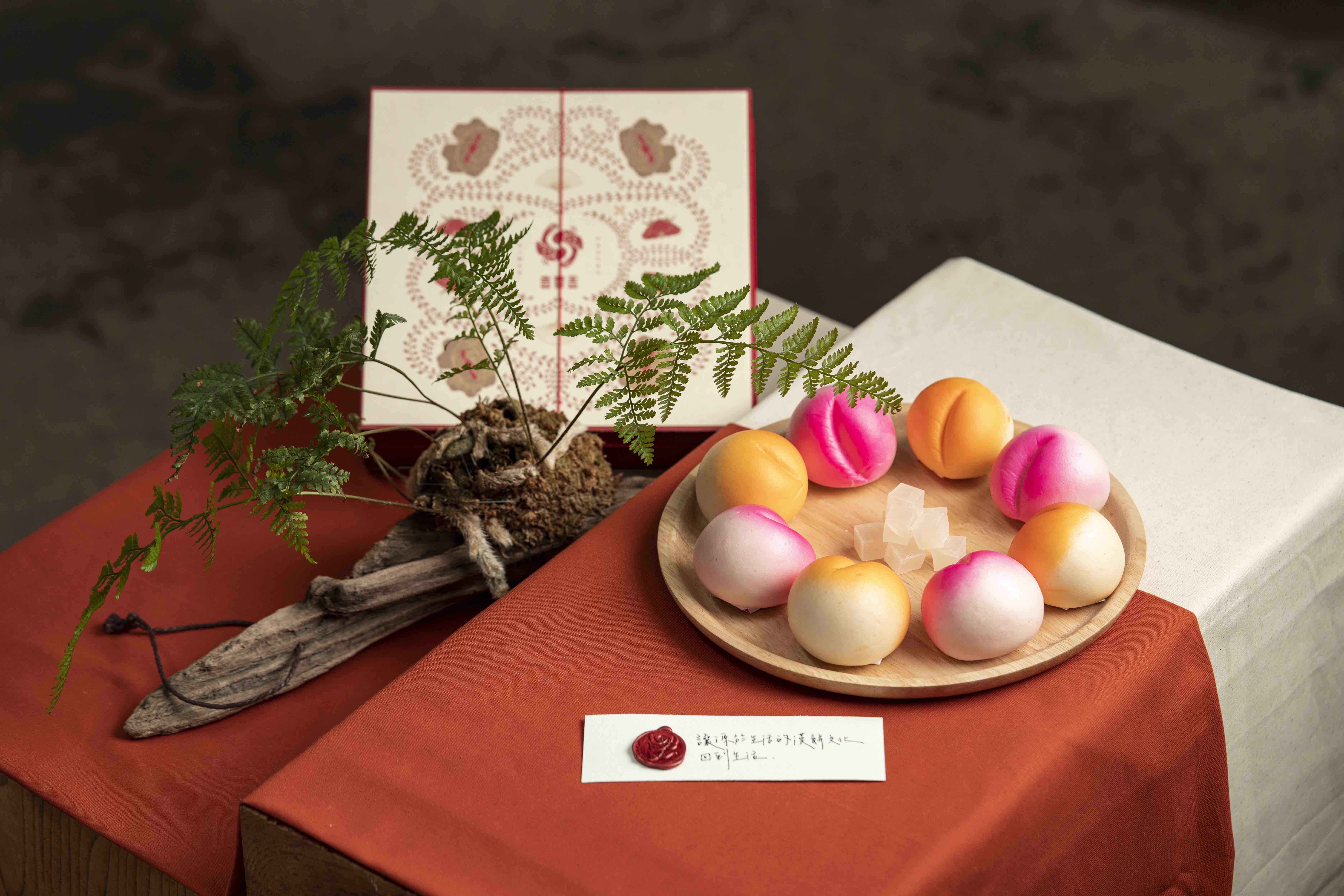 以粉膚色為基調,代表送禮人的真摯心意純粹;搭配盒面的芙蓉桂花圖樣,期許收禮與食桃者的事業蒸蒸日上、貴人滿滿。